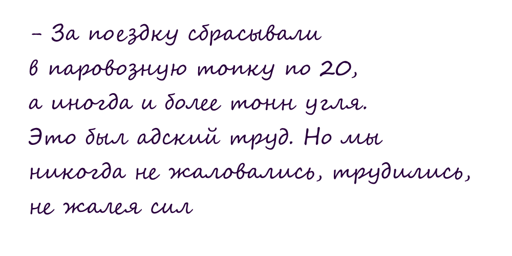 за смену перекидывали лопатой в топку паровоза женщины, заменившие ушедших на фронт мужчин